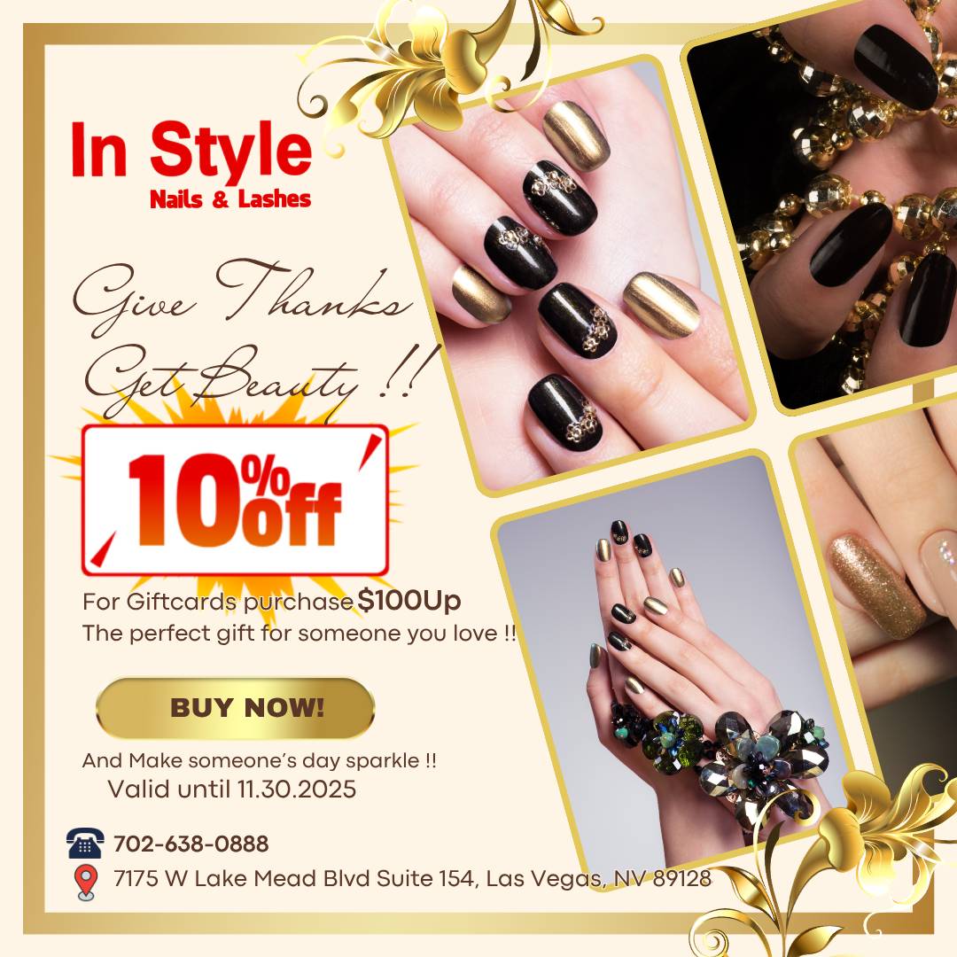 Located in the heart of Las Vegas next to Panera Bread, InStyle Nails & Lashes has proudly served the community for over 16 years. Known by our clients as the “Best Las Vegas nail salon” and “Best lash extensions in Las Vegas”, we specialize in luxury manicures, intricate nail art, precision lash extensions, and full-service beauty care. Our licensed professionals focus on quality, comfort, and personalized service in a clean, modern, and relaxing environment. Book your appointment today and experience why we’re one of the top-rated nail and lash salons in the city.
